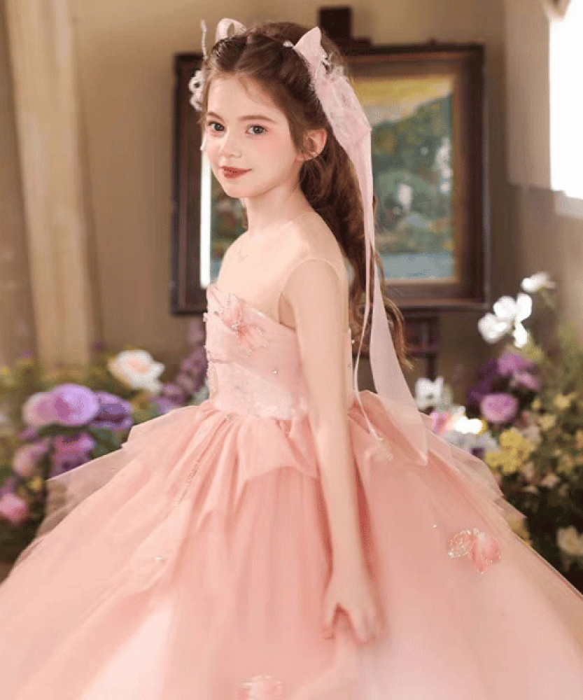 - يتميز الفستان بتطريز ناعم من الخرز والزهور الصغيرة، مع فيونكة خلفية أنيقة تمنح إطلالة الأميرة لمسة مميزة وراقية.