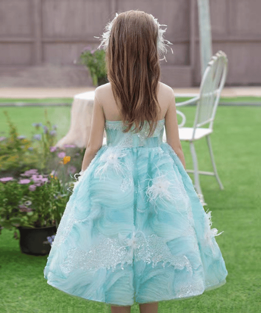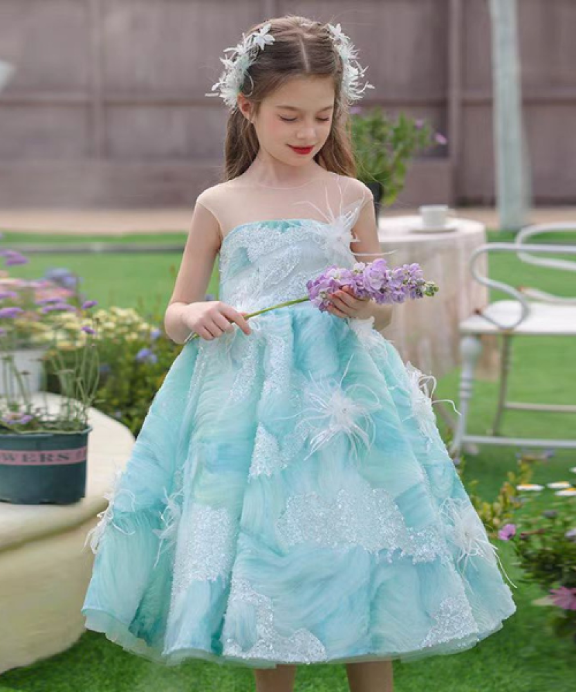 تصميم ساحر مستوحى من أناقة الأميرات بلمسة عصرية حالمة، يجمع هذا الفستان الفيروزي بين النعومة، الرقي، وتفاصيل الريش الراقية ليمنح فتاتكِ حضورًا يخطف الأنظار في أبرز المناسبات.