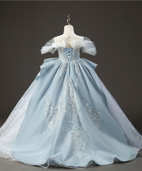 💙 فستان بناتي فخم بتصميم ملكي وألوان سماوية جذابة، مناسب للعيد والمناسبات الخاصة.