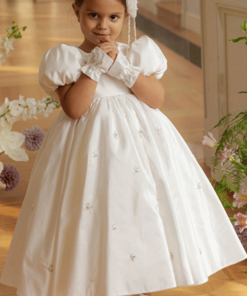 فستان أنيق من الساتان الأبيض والتول الناعم، صُمم بإتقان ليمنح طفلتك لمسة فاخرة مستوحاة من إطلالات الأميرات.