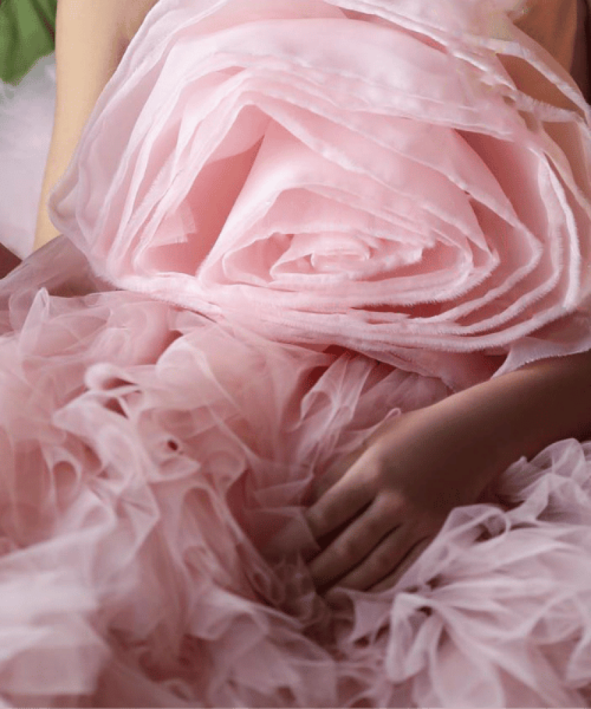فستان أنيق مستوحى من جمال الزهور الطبيعية، يتميز بتزيين يدوي رائع يعكس العناية بأدق التفاصيل.
